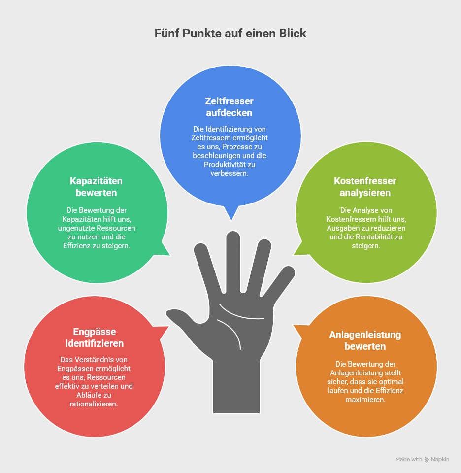 Genau darauf finden wir die Antworten im 1. Schritt des Optimierungssupport. Wir nehmen Ihr Team auf die Suche mit und vermitteln praxisorientierte Vorgehensweisen + Methoden. Beispielsweise die automatische Auswertung Betriebstagebuchs mit Bordmitteln.