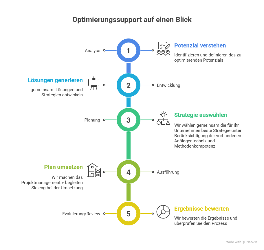 Mit unserem Optimierungssupport erhalten Sie die nötige Unterstützung, um effizient und fundiert Ihre Verfahren + Prozesse zu optimieren – ohne Ihr Tagesgeschäft zu vernachlässigen. Wir begleiten Sie kontinuierlich, methodisch und mit technischem Tiefgang – damit Ihre Prozesse dauerhaft leistungsfähig und wirtschaftlich bleiben.